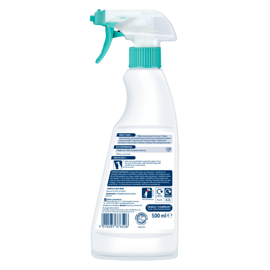 Dr. Beckmann Spray Starch & Easy Iron combines two effective processes in one, making ironing easier than ever. The innovative formula creates natural tension, while ensuring easy smoothing of stubborn creases and wrinkles. You can even remove ironed-in creases, and the flattening of fibres helps prevent new wrinkles as well as repelling dirt. Giving your textiles perfect, controlled body and a crease-free finish for a well-groomed look and a comfortable feel.