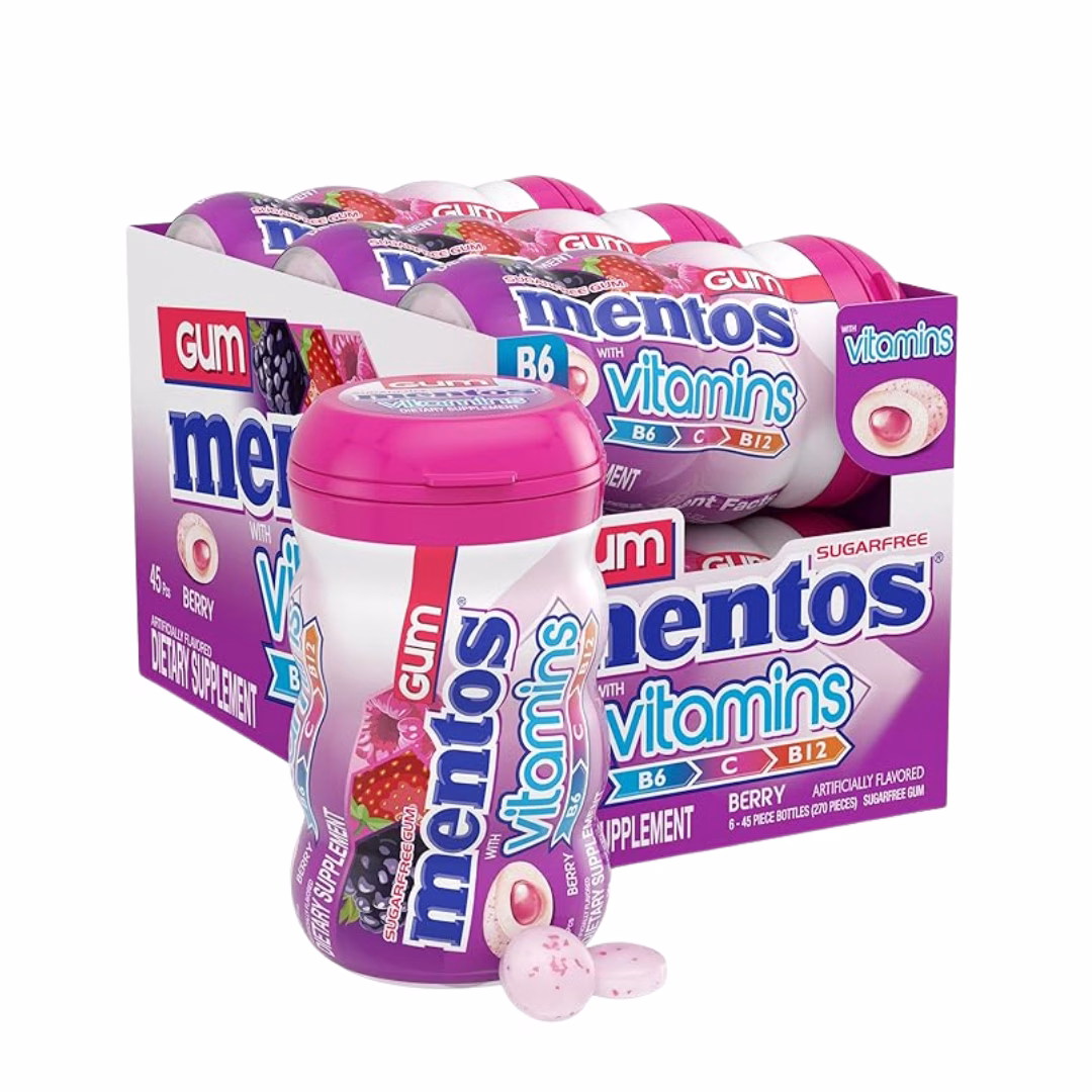 Have a fresh day with Mentos Gum with Vitamins! Each piece of this sugar-free, Berry flavored gum, contains 30% of your daily value vitamins B6, B12 and C, giving you a blast of Berry flavor that lasts chew after chew. Mentos Gum with Vitamins comes in a convenient curvy bottle, perfect to keep at your desk, in your car, at home, or anywhere you may want some freshness! with 45 pieces per bottle, you can make fresh connections by sharing or keep all the freshness to yourself. Sugar-free and containing vitamins for a guilt-free FLAVOR sensation!