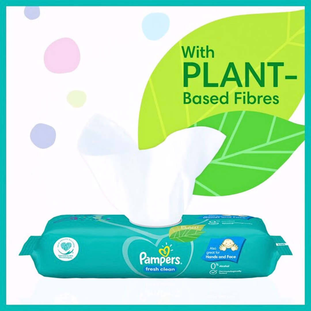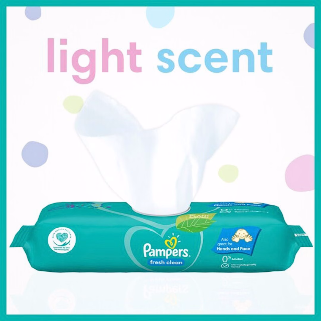 Your baby’s skin is very delicate and deserves a gentle all-over clean on delicate body parts such as bum, hands and face. Pampers Fresh Clean baby wipes now provide an even better cleaning (vs. previous product) thanks to their softer and thicker fabric, still with the refreshing scent you love. The enzymes in pee and poo alter the skin’s pH, increasing the risk of irritation and rash. All Pampers baby wipes contain a unique formula that protects natural skin pH better than cotton wool and water, so that your baby’s delicate skin is clean and protected from skin irritation. Pampers Fresh Clean baby wipes are dermatologically tested and approved by Skin Health Alliance dermatologists. Because Pampers Fresh Clean baby wet wipes are designed with babies’ delicate skin in mind, they do not contain alcohol, dyes.